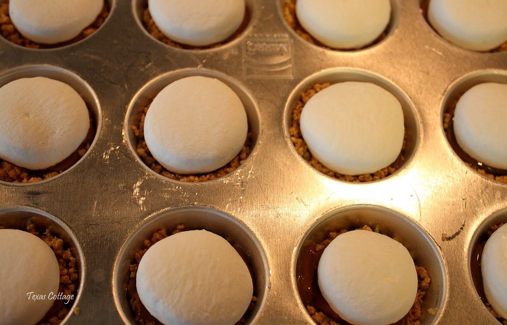 Place one marshmallow half, cut-side down, into each cup. Return to oven