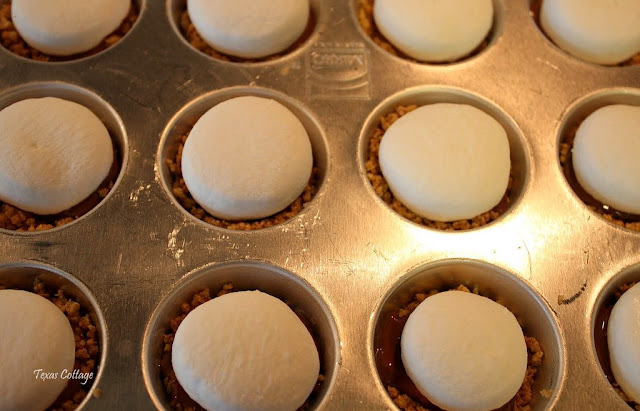 Cut marshmallows in half crosswise using shears dipped in cold water. Place one marshmallow half, cut-side down, into each cup. Return to oven 1-2 minutes or until marshmallows are slightly softened. Remove pans from oven to cooling rack; cool 15 minutes. Carefully remove cups from pan. Cool completely.